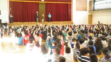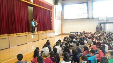 緞帳のわずかなすき間から見える一瞬をとらえて、色や形や人をあてるゲームです。わずかな手がかりから正解をあてようと、気持ちを集中して見ている子が多く、いつも以上に子どもたちは真剣にゲームに取り組んでいました。