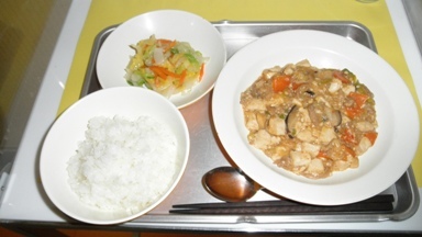 ご飯、家常豆腐、辣白菜、牛乳