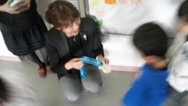 今週になり急きょシドニーオリンピックシンクロナイズドスイミングチーム日本代表選手であり銀メダリストの江上 綾乃さんが来校して子どもたちに話をしてくださいました。自分がなぜオリンピックを目指したのか、オリンピックはどんなよさがあるのかなど夢のある話をしてくださいました。最後は、個人名入りの銀メダルを一人一人の子どもに見せてくださっただけでなく、さわらせてもらった子もいます。今日の感動を胸にオリンピックを目指す子があらわれるかもしれません。楽しみです。
