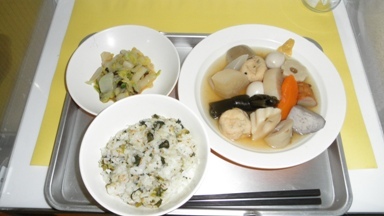 菜めし(大根葉)、大蔵大根おでん、白菜の塩こんぶかけ、牛乳