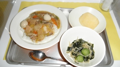 中華丼、じゃこサラダ、リンゴ、牛乳
