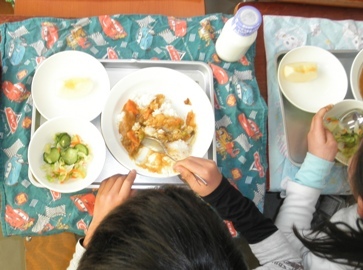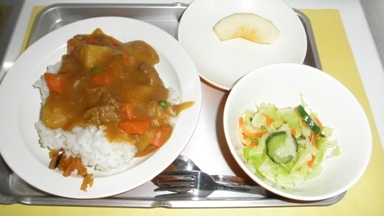 カレーライス、福神漬、野菜の甘酢かけ、リンゴ、牛乳