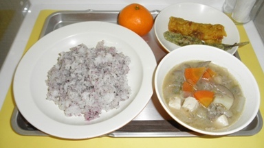 ゆかりご飯、シシャモの磯辺揚げ、ちくわのカレー揚げ、豚汁、ミカン、牛乳