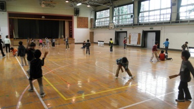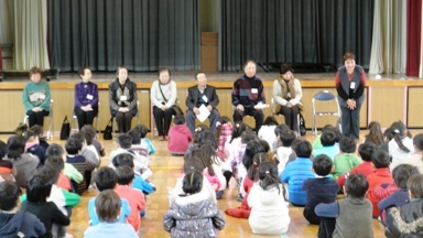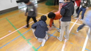 1年生が昔遊びをお世話になっている寿会の皆さんや祖父母の皆さんに教わりました。メンコをフリスビーのようにして遊ぶものと思っている子がいる一方で、羽子板では空振りの連続で苦戦していました。