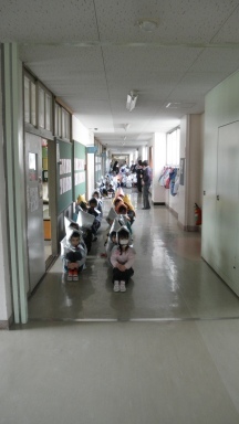 雪の影響で2週間近く校庭が使えません。そのため、避難訓練は昨年できなかった起震車体験を予定していましたが、今回もまた実施できませんでした。今日も校庭が使えないため、放送の指示で廊下に避難し人員点呼及び本部報告をしているところです。