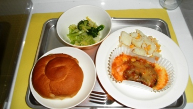 パインパン、魚のピザ風、コーンポテト、ブロッコリーのサラダ、牛乳