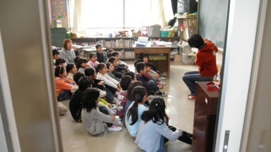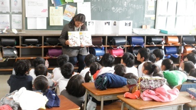 朝読書で読み聞かせをしている2年生の教室の様子です。絵を見せ子どもたちにお話のイメージをふくらませながら読み聞かせています。