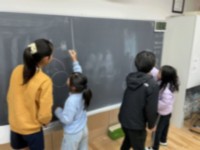 1年生がくだものあてクイズをしている様子です。自分が好きな果物を同じグループの子が質問をしながらあてるクイズです。どんな質問をするとよいのかをほかの子の質問内容と違う角度から考えなければなりません。クイズをしながら自然と国語の話す力や聞く力が育つ学習です。