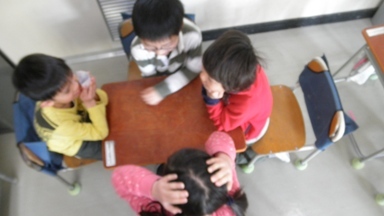 1年生がくだものあてクイズをしている様子です。自分が好きな果物を同じグループの子が質問をしながらあてるクイズです。どんな質問をするとよいのかをほかの子の質問内容と違う角度から考えなければなりません。クイズをしながら自然と国語の話す力や聞く力が育つ学習です。
