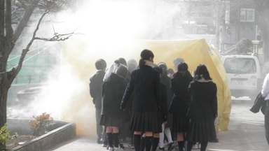 煙を吸いこまないようにして、落ち着いて安全に避難する訓練です。小学校でも年に1回、煙中避難訓練を実施しています。