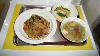 きのこご飯、豚汁、カブのレモン醤油かけ、牛乳