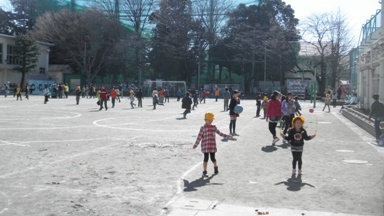 朝方降った雪は鉄棒側の土を白くするだけでした。日中は暖かな天気となり、元気に外遊びをする子がたくさんいました。
