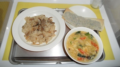中華おこわ、中華風コーンスープ、棒餃子、牛乳