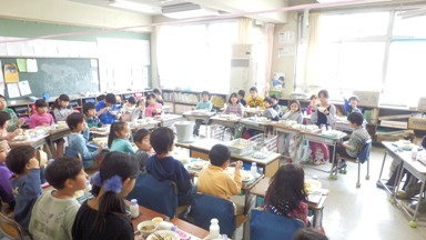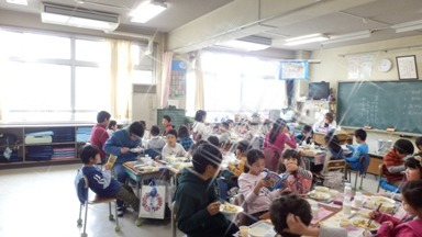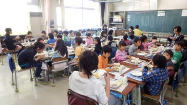 6年生を送る会の日は、6年生が各学級に分かれて一緒に給食を食べます。1年生の教室では、ひときわ大きくみえます。