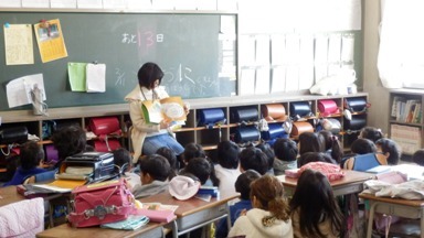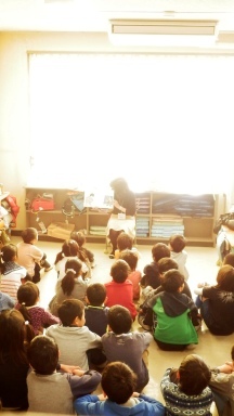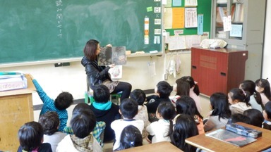 2年生の読み聞かせの様子です。子どもたちは集中して聞いています。