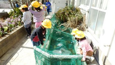 春の陽気に、いつも水の穴にもぐって寝ているカメさんたちが日向ぼっこを始めました。その様子に気付いた1年生が集まって様子をみていました。立派な観察です。