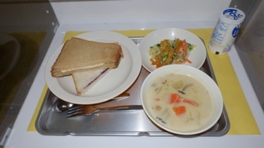 二色サンド(ブルーベリージャム、クリームチーズ)、季節野菜のクリームシチュー、パリパリサラダ、ジョア