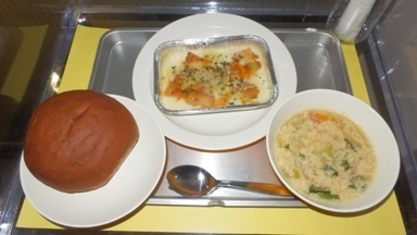 ココアパン、ポテトグラタン、チーズのふわふわスープ、牛乳