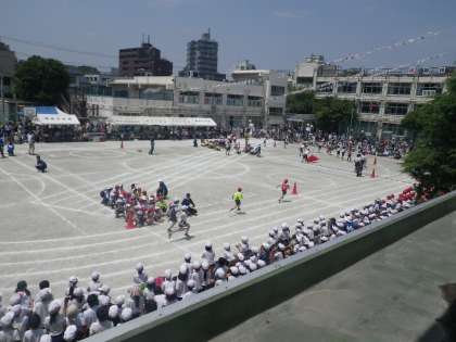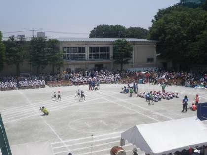 リングバトンを最後の走者まで、勝負をあきらめないでつないでいきました。真剣に走る子どもたちに、たくさんの拍手をいただきました。(低学年リレー)