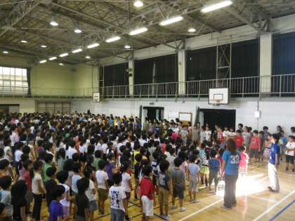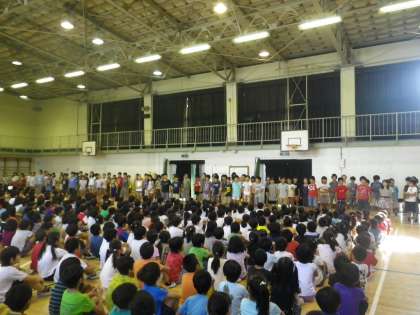 4年生がリードし、みんなで楽しく音楽に合わせて体で表現しました。
