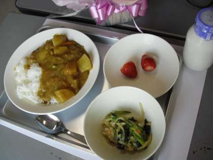 カレーライス 牛乳 和風サラダ いちご