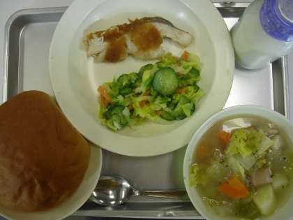 ミルクパン 牛乳 メルルーサのバーベキューソースかけ フレンチサラダ ポトフ