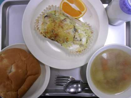 ☆今日の魚は、ニュージーランドなどでとれる『ホキ』という白身魚でした。牛乳とマヨネーズをあわせたソースをたっぷりかけて、チーズとパン粉を上にのせて焼きました。グラタンのような見た目と味で、ほとんど残りがありませんでした。