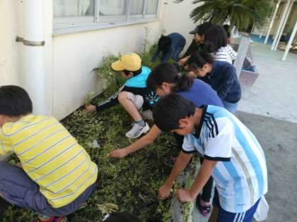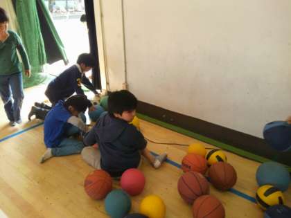 放送委員会は今年度の放送について話し合い、栽培委員会は花壇の草を抜いていました。運動委員会はボールの空気入れです。