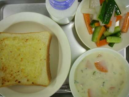 ガーリックトースト 牛乳 クラムチャウダー ピクルス
