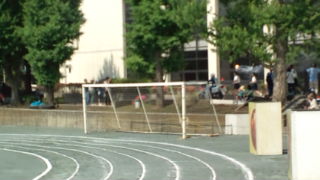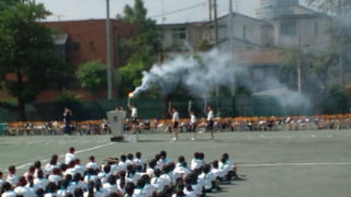 運動会日和の中、瀬田中学恒例の聖火です。パトカーの先導で入場です。