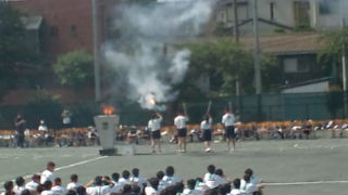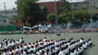 運動会日和の中、瀬田中学恒例の聖火です。白バイ(先ほどのパトカーは、間違いでした。)の先導で入場です。
