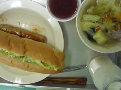 ☆今日のセルフウィンナーサンドは、給食室で、切れ込みを入れたコッペパンにソテーしたキャベツを挟みました。ウィンナーはそのまま配り、自分で挟んで食べるようにしました。低学年の子も、上手に挟んで食べていました。
