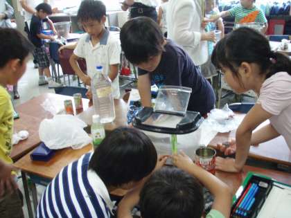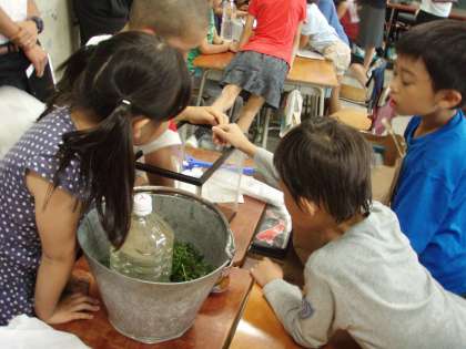 さあ、できあがったすみかにザリガニを入れてあげると