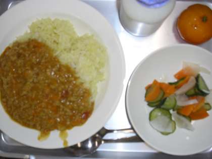 キーマカレーライス 牛乳 野菜の甘酢かけ 冷凍みかん