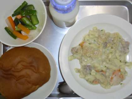 あしたばパン 牛乳 マカロニのクリーム煮 ピクルス