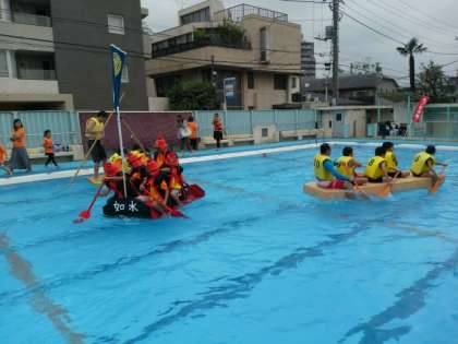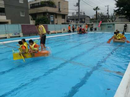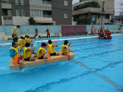 8月31日のアドベンチャーイン多摩川に出場予定のいかだの進水式を行いました。