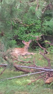 なんと、宿の中庭に、小鹿が、いました。何か、食べています。珍しいので、子どもたちに、代わる代わるに、見せました。そうっとそうっとです。