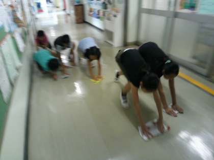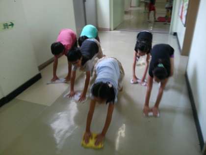 5年生が職員室前の長い廊下を雑巾がけしています。