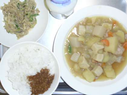ご飯 かつおでんぶ 牛乳 鶏じゃがうま煮 ごま酢和え