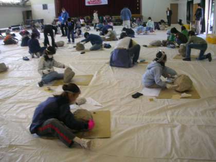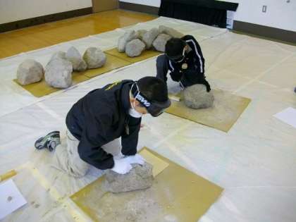 11月21日(土)。世田谷区と多摩美術大学が共同で進める「才能の芽を育てる体験学習」が本校体育館で行われました。今回のテーマは「石の彫刻」。学校運営委員の一人でもある、多摩美術大学教授の海老塚耕一先生の指導のもと、世田谷区内から集まった約70名の児童は黙々と石と向かい合って形を作っていました。瀬田小からも9名の5・6年生が参加し、貴重な体験を楽しんでいました。