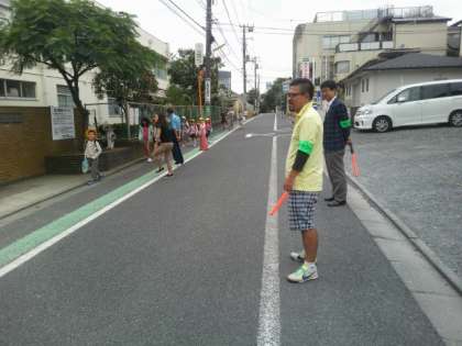 土曜授業の時にはいつもです。子どもたちに声をかけ、登校時の安全を確保してくださっています。子どもたちは、地域に見守られているという実感をもつことができます。