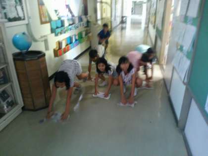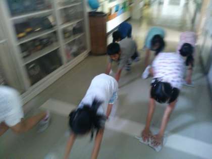 職員室前の長い廊下を5年生が雑巾がけをしていました。