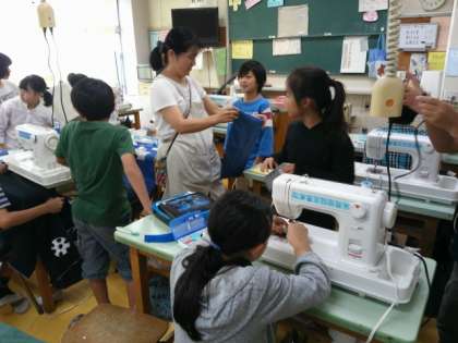 バッグの袋口を縫い上げるための説明に実物投影機を使っています。