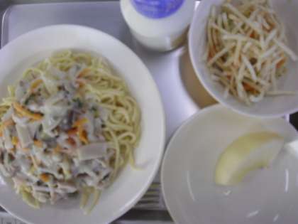 きのこクリームスパゲッティー 牛乳 じゃがいものハニーサラダ りんご