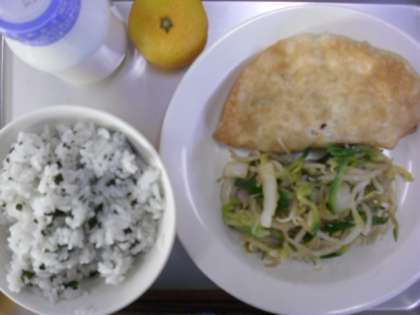わかめご飯 牛乳 ジャンボ餃子 白菜の中華サラダ みかん
