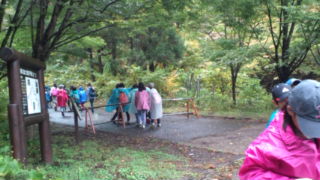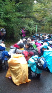 9時予定通り出発しました。雨上がりの清々しい空気の中ハイキングをします。クラスで、記念写真を撮り、グループで、仲良く行動です。