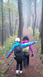 明るくなった山道を下り始めると、もやがかった下り道です。気持ちの良いコースです。