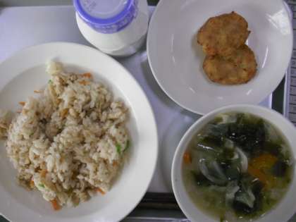 子ぎつねご飯 牛乳 味噌汁 豆腐ナゲット