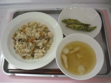 きのこご飯 牛乳 味噌汁 わかさぎの磯辺揚げ