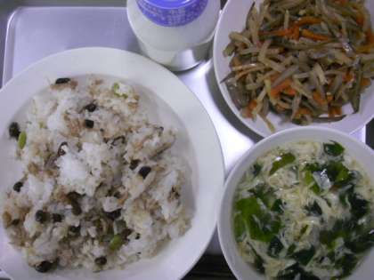 まめまめおこわ 牛乳 かきたま汁 きんぴら風炒め煮